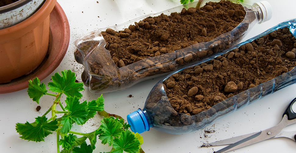 - Crea las macetas o contenedores: Para hacer las macetas corta un rectángulo en la botella de plástico con las tijeras y haz cuatro agujeros en la parte inferior para el drenaje.